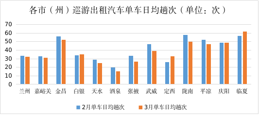 目前,全省合规网络预约出租汽车总计4891辆。据网约车监管信息交互系统统计,我省网络预约出租汽车每天运营高峰主要在8-9时,在线运营率为80%左右。其中,网约车经营发展较好的兰州市,约车日均高峰期出车率为84%,单车日均行驶里程约200公里左右,载客率66%,空驶率34%,网约出租汽车驾驶员工作时长约为9.05小时,单车日均接单量13单。兰州市14家正常运行的网约车平台总体抽成比例在14%-28%之间,抽成均值为20%。2月和3月,网约车订单合规率较高的平台是创业者出行、阳光出行和携程用车。