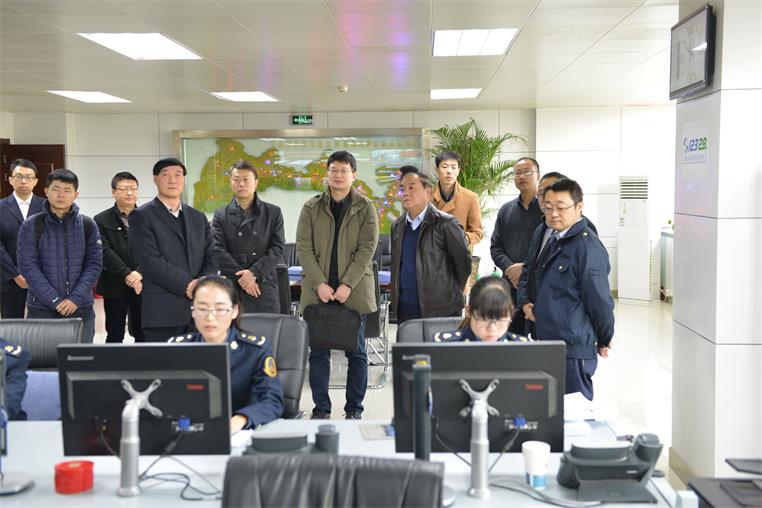 图为检查组在省道路运输应急指挥中心了解“两客一危”监控平台、道路运输应急指挥平台等运行工作情况。