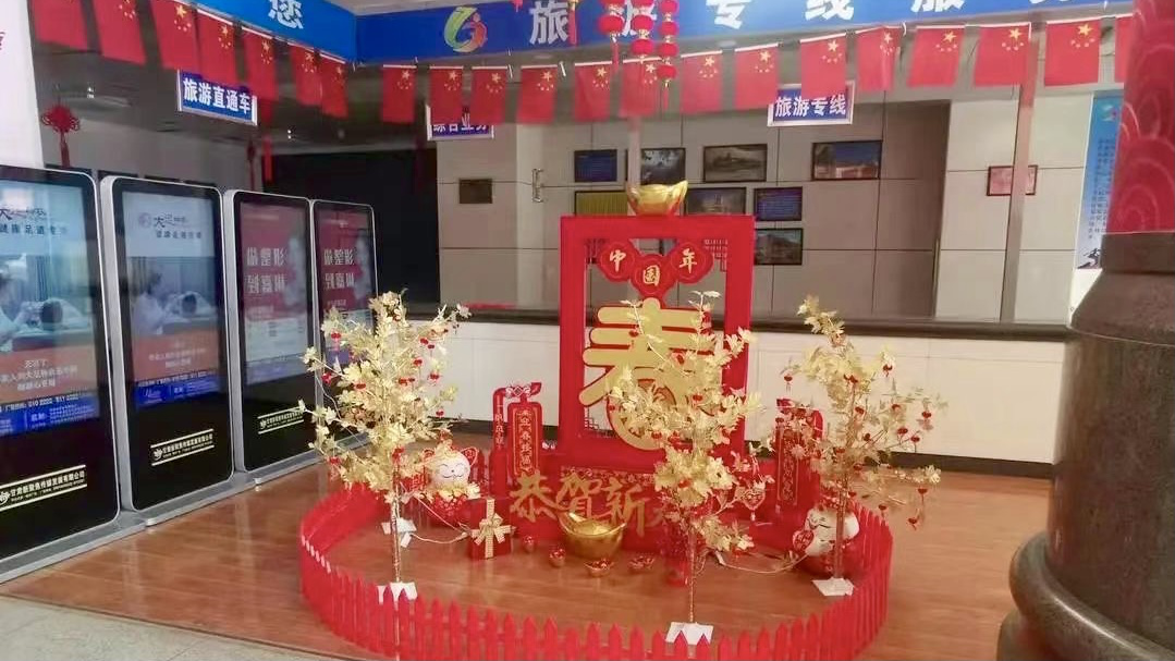 △兰州客运中心、汽车东站在站内重点位置悬挂春运宣传标语、在候车大厅悬挂灯笼、在客运车辆上张贴福字,营造新春节日氛围,为旅客提供温馨、美观、舒适的出行环境。