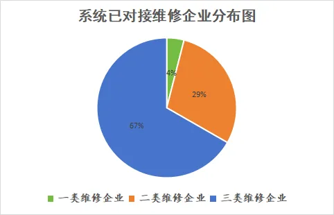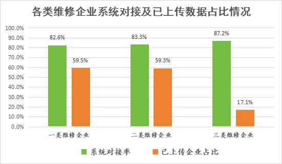 2026年第一季度已完成系统对接的汽车维修企业中,一类企业152家,二类企业1114家,三类企业2540家,对接率分别为82.61%、83.31%、87.17%。