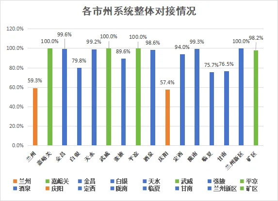 其中武威、嘉峪关、平凉、矿区对接率达100%;金昌、天水、酒泉、定西、陇南、兰州新区对接率较高,均在90%以上;兰州、庆阳对接率较低,均在60%以下。