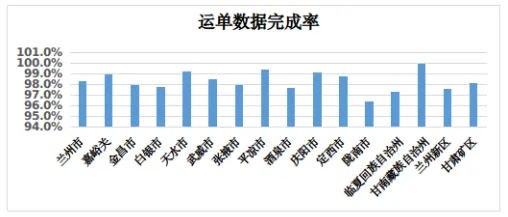 从地区来看,嘉峪关、天水、平凉、庆阳、甘南运单完成率达到99%以上。