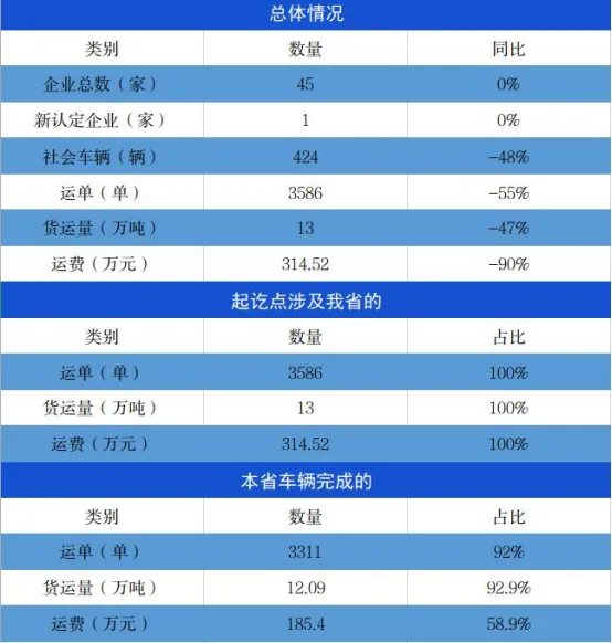 一季度,全省网络货运企业共计整合社会车辆424辆、上传运单3586单、完成货运量13万吨,货运周转量约1915万吨公里,结算运费314.52万元,较2025年度同比分别下降48%、55%、47%、86%、90%。