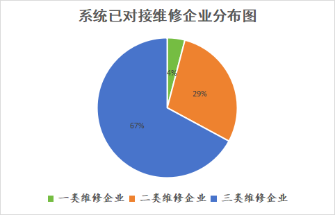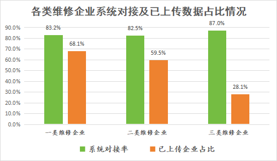 截至12月底,完成系统对接的维修企业3764家,其中,一类企业153家,二类企业1085家,三类企业2526家,对接率分别为83.15%、82.51%、87.01%。