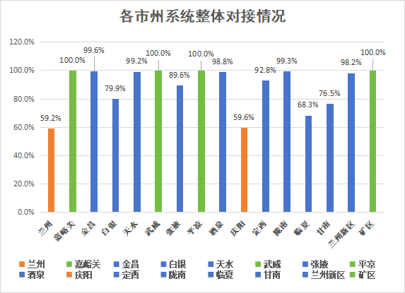 其中武威、嘉峪关、平凉、矿区对接率达100%;金昌、天水、酒泉、定西、陇南、兰州新区对接率较高,均在90%以上;兰州、庆阳对接率较低,均在60%以下。